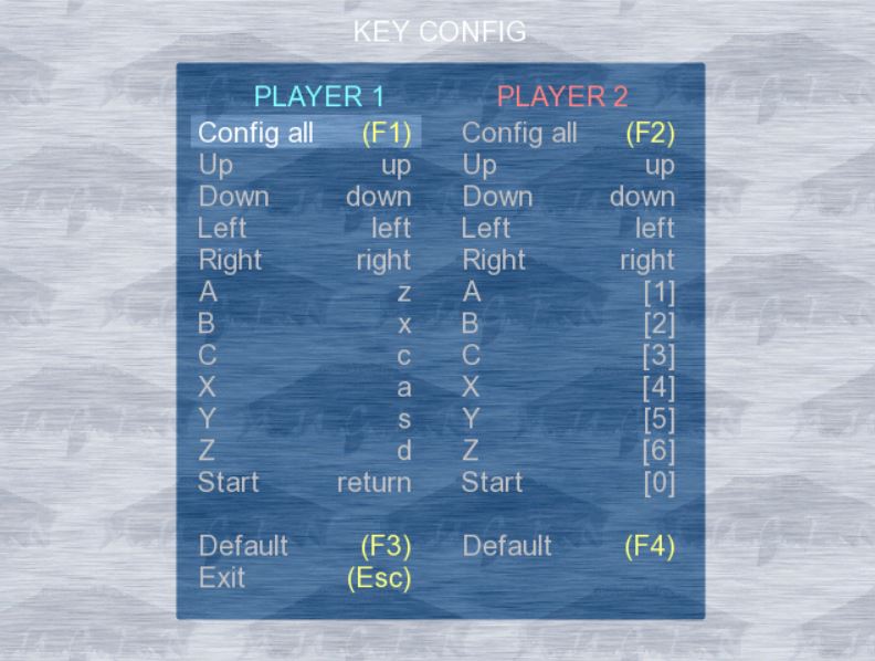 Key Configは、F1キーを押すと1Pのキー設定を変更、